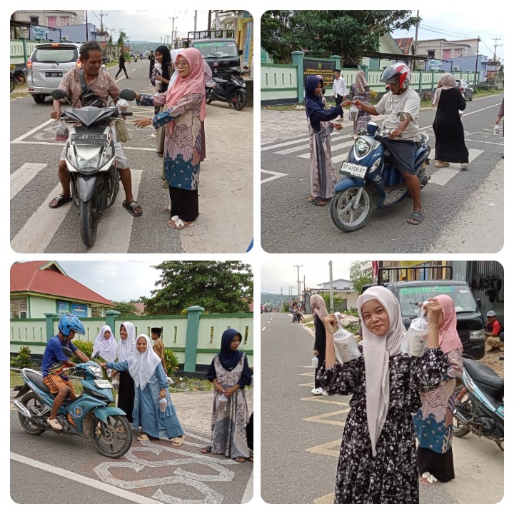 Ketua OSIM MTsN 4 Buteng Fanesya An’nur Wijaya (siswi kelas 8A) bersama para pengurus OSIM lainnya terlihat sigap mengatur jalannya pembagian takjil agar tetap tertib dan tidak mengganggu arus lalu lintas.