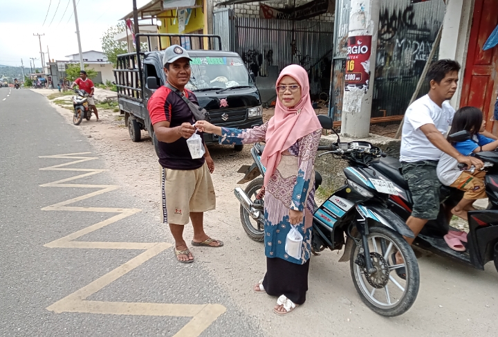 Kepala MTsN 4 Buton Tengah, Asman Bandera, S.Pd, memulai pembagian takjil gratis, kemudian diikuti oleh para pengurus OSIM.