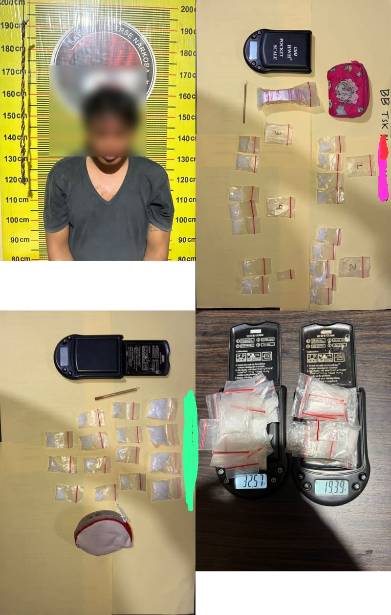 Dalam penggeledahan yang disaksikan warga, petugas kembali menemukan 17 paket plastik klip berisi kristal bening yang diduga sabu yang disimpan di dalam sebuah dompet emas, beserta barang bukti lain berupa sendok sabu, timbangan digital, serta plastik klip kosong yang diduga digunakan untuk aktivitas peredaran narkotika.